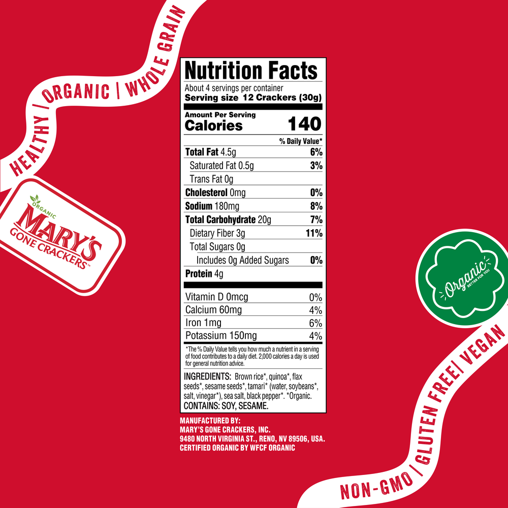 Bright, zesty black pepper meets Mary’s signature whole-food crunch for a cracker that knows how to bring the flavor. Mary’s Gone Crackers Black Pepper Crackers are packed with organic grains and seeds, each bite delivers clean fuel with a little extra attitude. Snack them straight or stack up your favorite toppings—they’re peppery perfection either way.