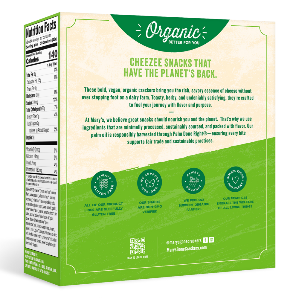 This cracker brings rich, cheesy flavor and a bright herbal twist—all completely dairy-free. With a toasty crunch and organic, plant-based ingredients, it’s a feel-good, flavor-packed bite made for snack boards, game nights, and adventure days alike. One taste and it instantly becomes a new go-to.