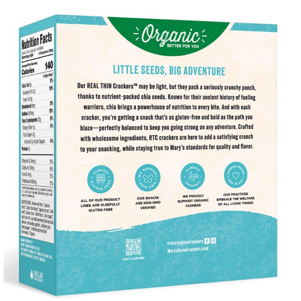 Mary’s Gone Crackers Real Thin Organic Sea Salt Crackers are the snack for anyone who loves a light, airy crunch that still brings real substance. Made with organic, gluten-free ingredients and a just-right sprinkle of sea salt, these thins make topping, dipping, or straight-up snacking effortless. Clean, crisp, and endlessly snackable—your pantry always has room for this classic.