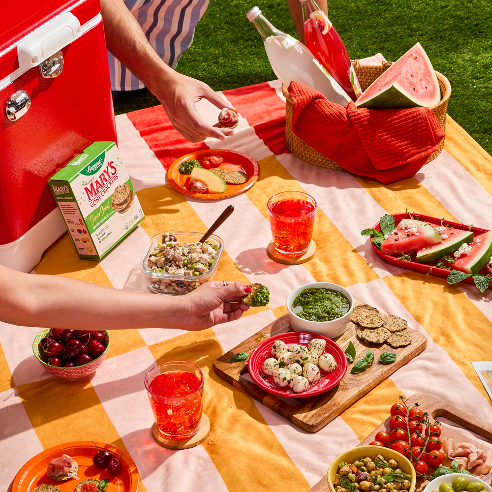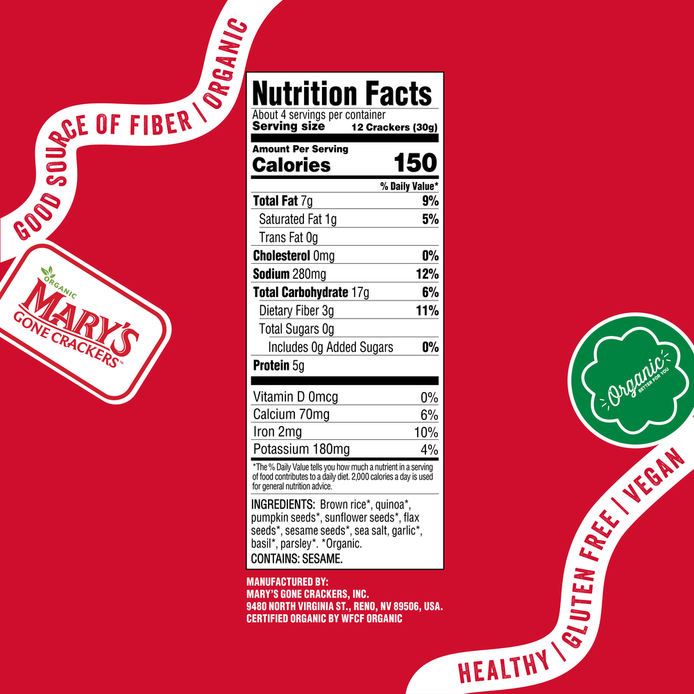 Aromatic basil and savory garlic make Mary’s Gone Crackers Super Seed Basil & Garlic Crackers an instant flavor favorite. With 5g of protein and a good source of fiber, it’s a crave-worthy cracker that brings freshness, crunch, and feel-good ingredients to every snack moment. Add toppings or enjoy straight from the box.